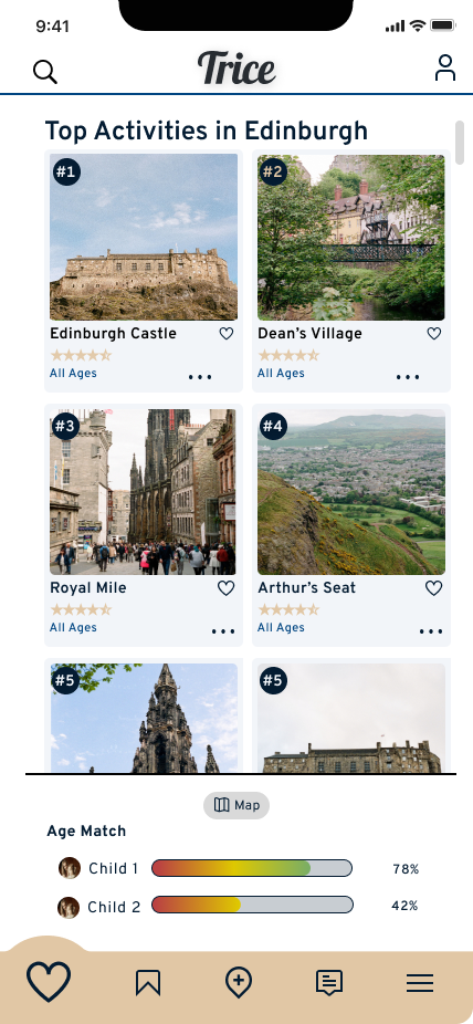 Parents usually had a rough idea of what they wanted to do while traveling, but when traveling to new or unfamiliar destinations, Users wanted extra support or confirmation that the decisions they were making would be ‘worth it’. This led me to emphasize a ‘Parent perspective’ in designing Trice. These findings also led to the design of 2 other features - Parent Reviews and the Age Match feature.